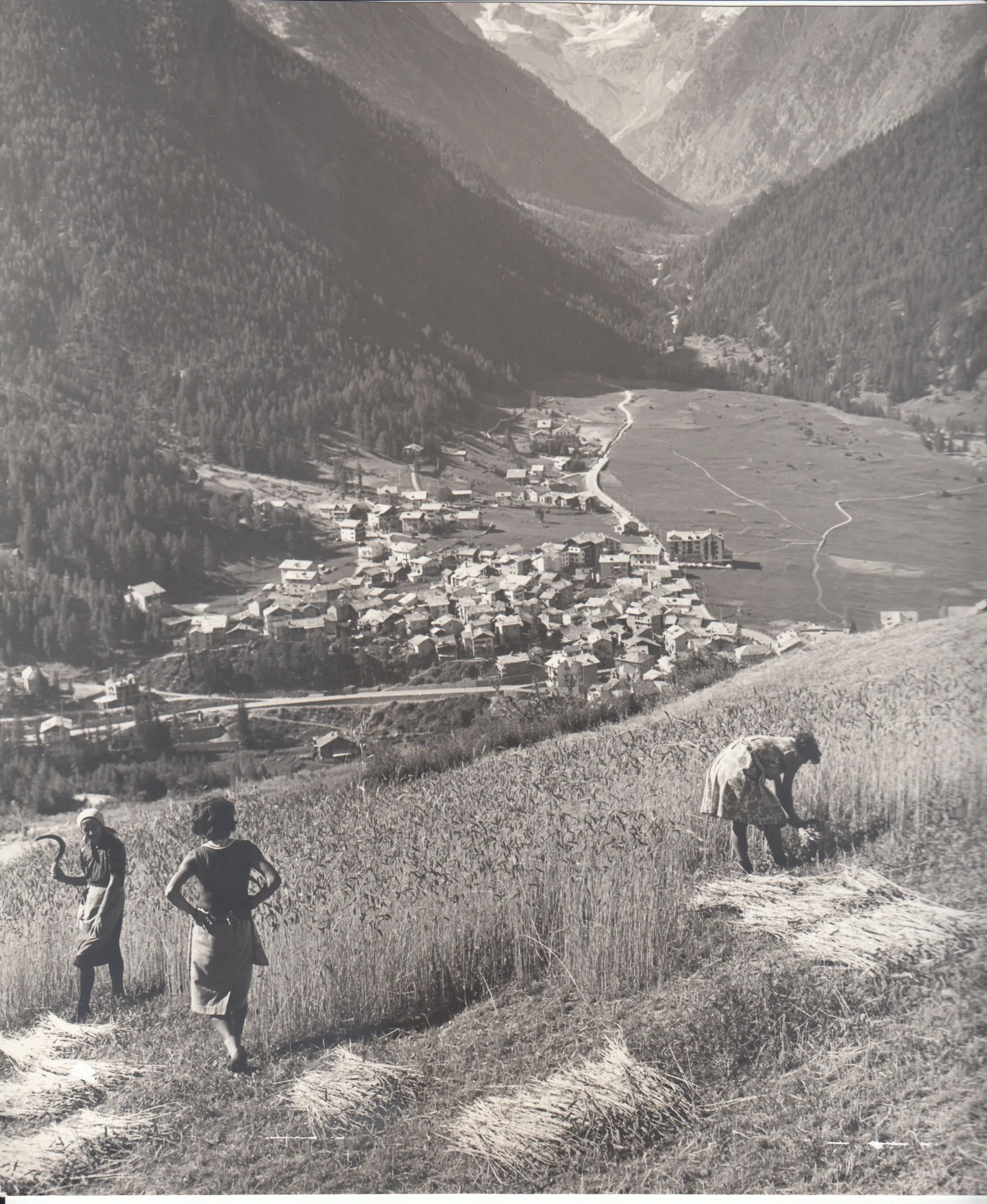 La première remontant à 1964 et prise par René Willien, est centrée sur les moissons au village de Gimillian ; c’est du seigle, vraisemblablement, que ces jeunes femmes récoltent. Le titre, en patois, est Le dérëre mierandëre de Dzemeillian et, en effet, il s’agit d’une considération plus que correcte. Aujourd’hui, sur ce même plateau il n’y a que de la prairie. L’agglomération de Cogne, par contre, n’a pas eu des énormes modifications. On reconnait aisément le célèbre Pré de Saint-Ours et, sur le fond, le Valnontey, l’un des endroits les plus renommés de la commune et très prisé, à bon titre, par les touristes.