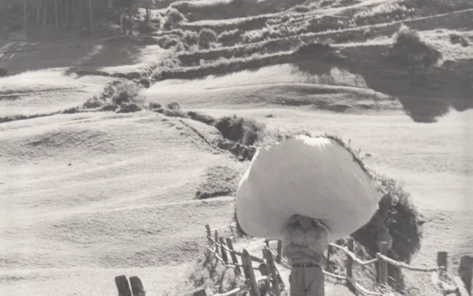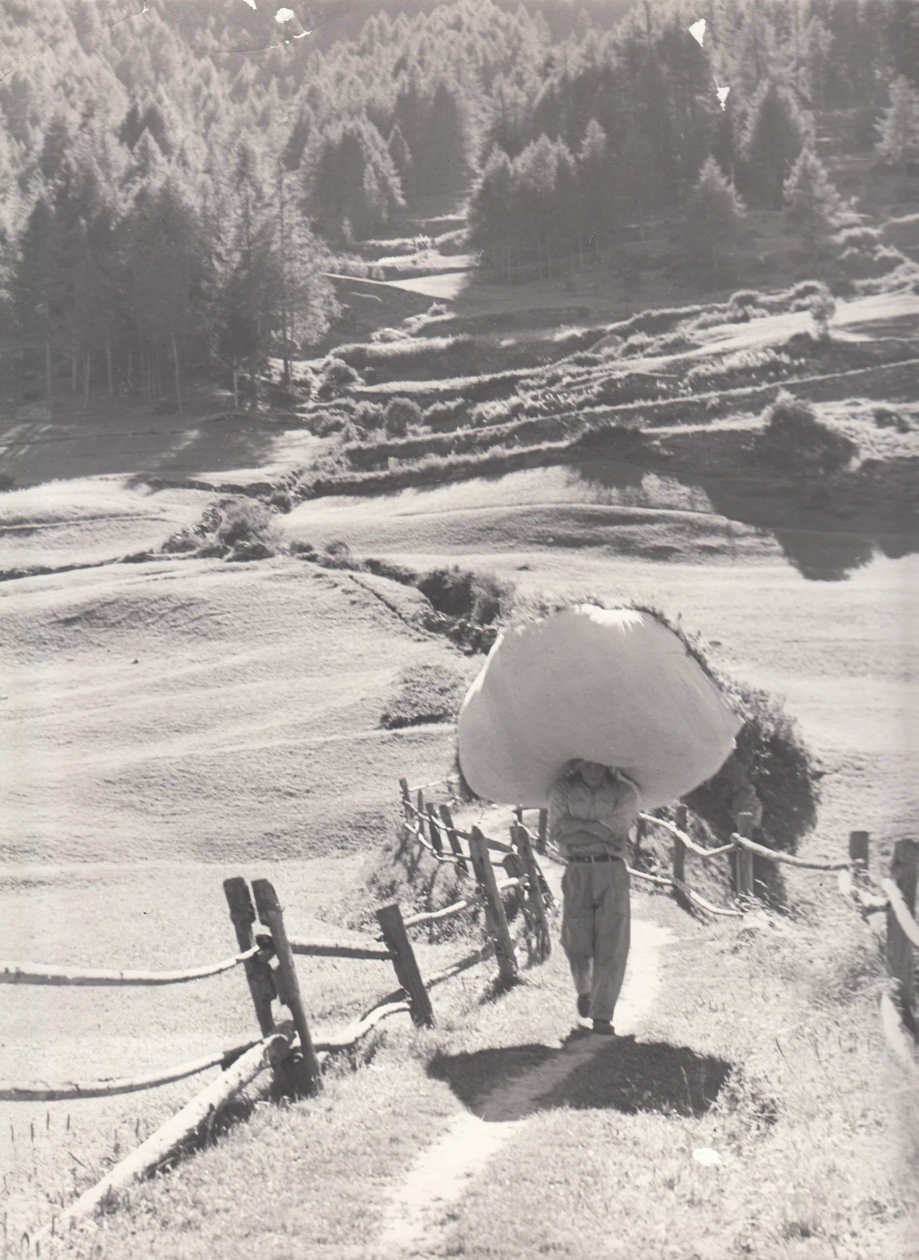 La deuxième photo prise elle aussi à Cogne, présente une image très rare de nos jours, celle d’un homme chargé d’un tas de foin qui est en train de rentrer chez lui. Son pas parait régulier afin de garder l’équilibre. Le titre est Transport di fen avouë la floriau ; La scène se passe à Crétaz, l’un des premiers villages de Cogne et la photo remonte, elle aussi, à 1964. L’harmonie du paysage, dessiné par l’œuvre des êtres humains pendant des siècles de dur labeur, est remarquable.